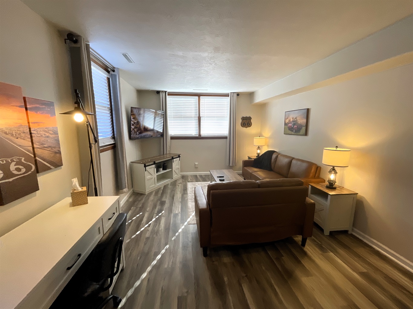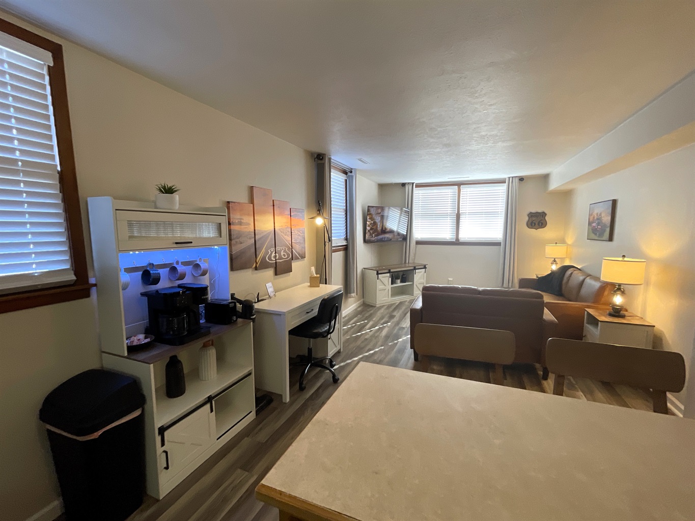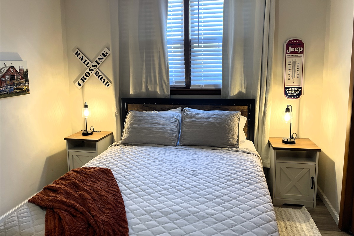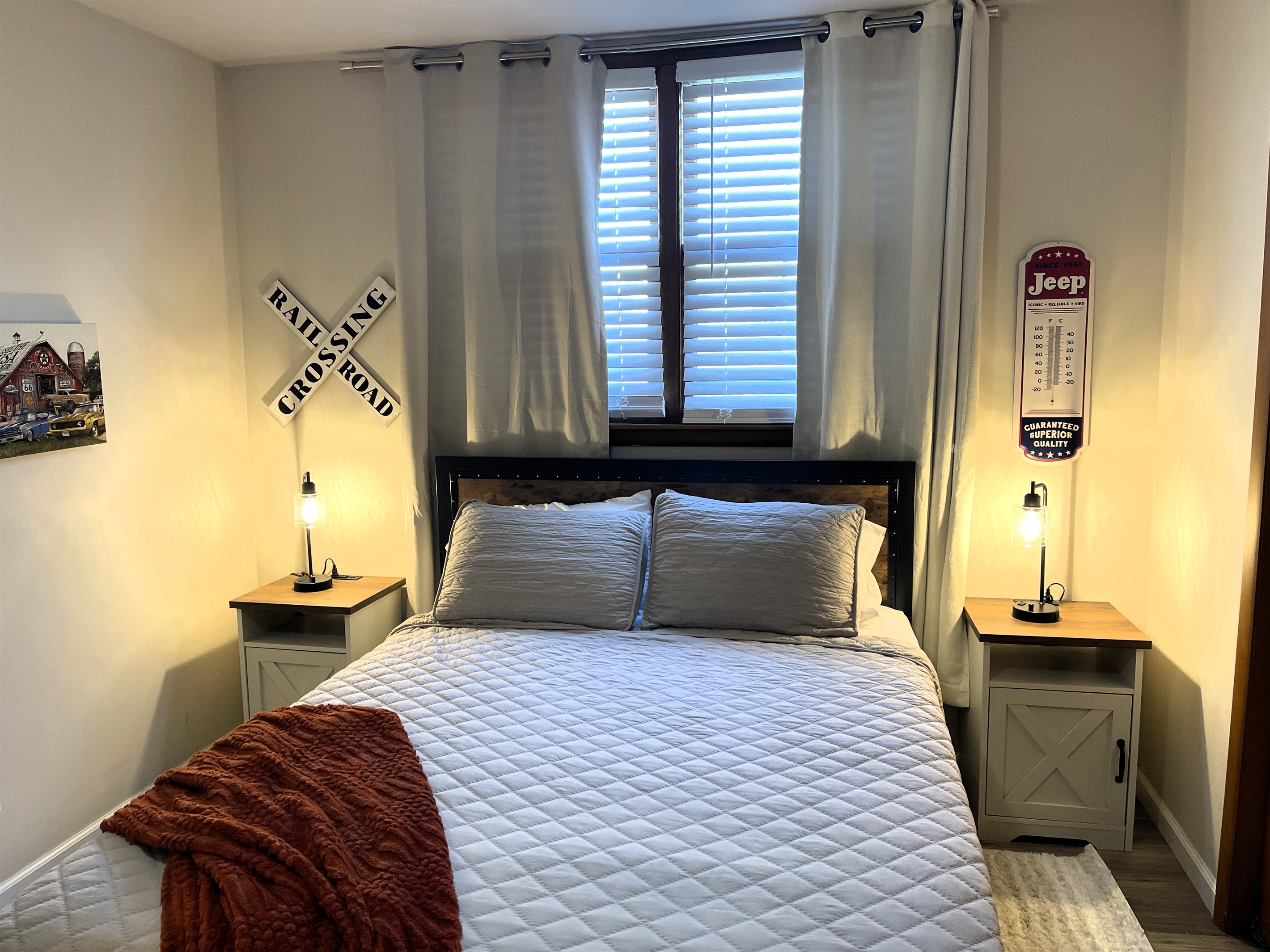 1 Bedroom • 1 Bathroom 1 Bath • Sleeps 1-2Step into comfort and style at our beautifully decorated Route 66 theme retreat in the heart of Normal, IL. Thoughtfully designed with warm tones, cozy textures, and unique décor, this space is perfect for relaxing after a day of exploring or unwinding with family and friends.