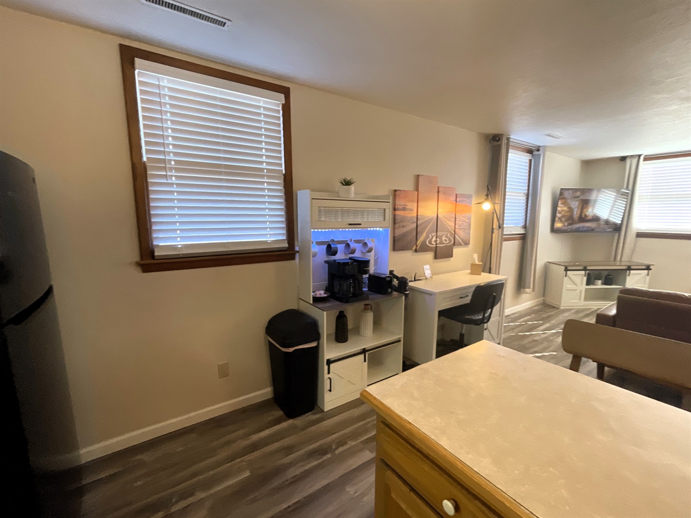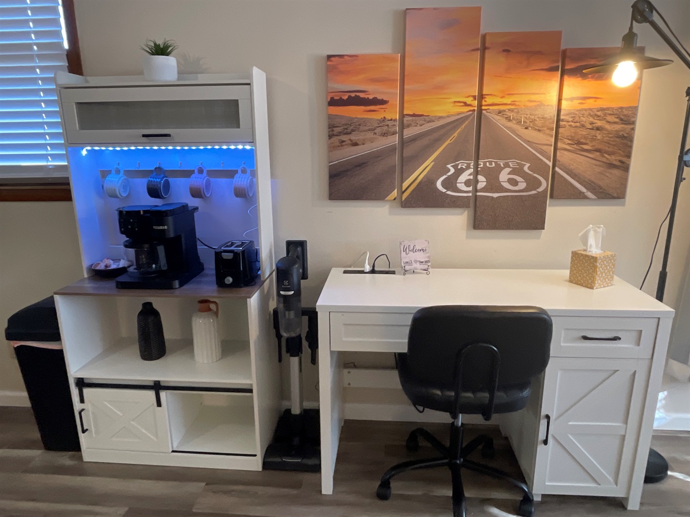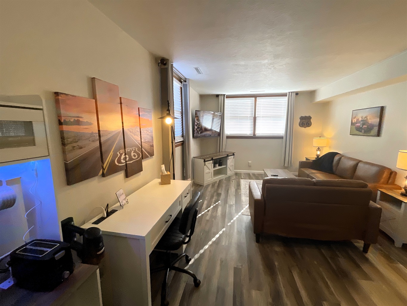 1 Bedroom • 1 Bathroom 1 Bath • Sleeps 1-2Step into comfort and style at our beautifully decorated Route 66 theme retreat in the heart of Normal, IL. Thoughtfully designed with warm tones, cozy textures, and unique décor, this space is perfect for relaxing after a day of exploring or unwinding with family and friends.